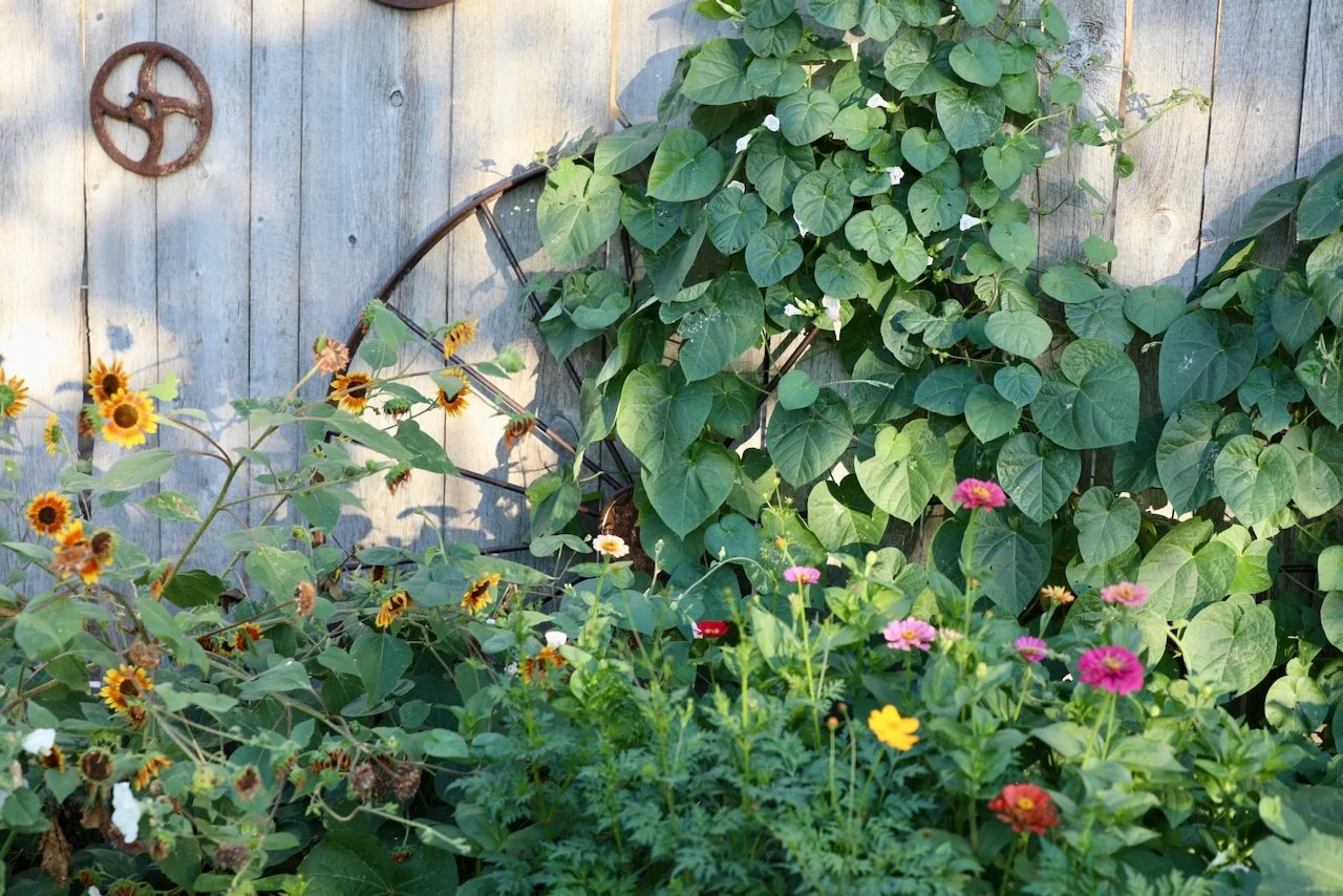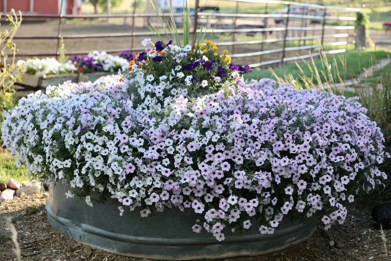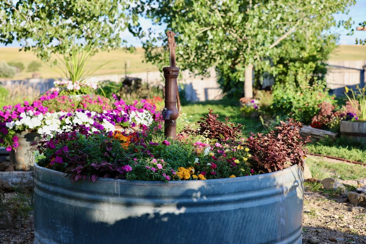 We had pretty good frost two nights ago in low spots on the ranch, however fortunately, the flowers at Rainbow's Pathfinder Garden came through in "Flying Colors". Robin, Kiersten, Julia, and Rachel are to be commended for their efforts. I have a hunch you won't find these views behind many chutes and arenas elsewhere.